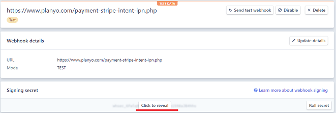 Once you click the Add endpoint button to submit the settings, the Signing secret section appears below Webhook details (see the picture below). Click the Click to reveal button to see the webhook secret and copy the value.