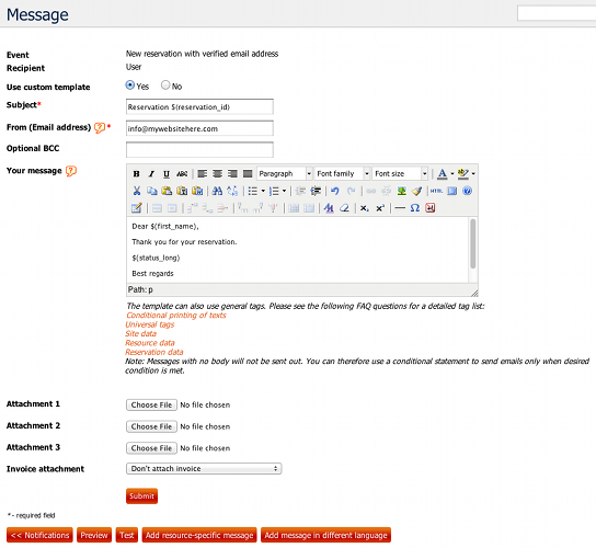 The subject and message body can also include a wide number of planyo tags which represent things like reservation ID, resource name etc. Practically all information associated with the planyo site, resource selected or the reservation can be extracted using the tags. You can for example write: Dear $(first_name), Your reservation number is $(reservation_id). This will be replaced by planyo by the actual data, e.g. Dear John, Your reservation number is R100. Please see the links below the message body for all the tags. You can also use conditional statements (