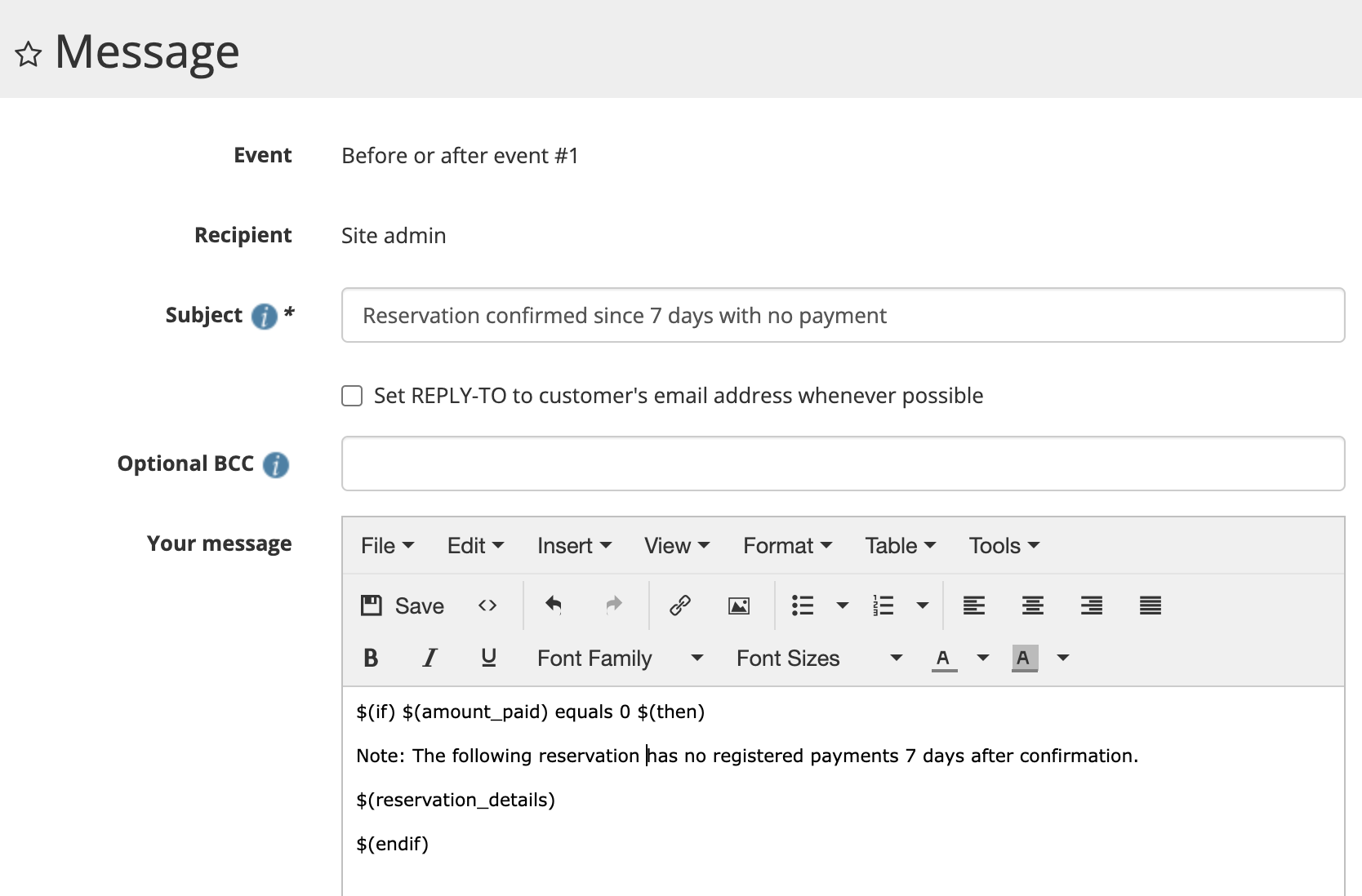 Edit to create the notification. In the body, we'll make sure the notification is sent to the main site admin only if no payment has been registered yet. Because Planyo never sends out notifications with empty body, we'll put the entire body inside an $(if) condition which will check the amount paid. Note that offline payments can be added by the administrators on the reservation details page and they will also block this notification.